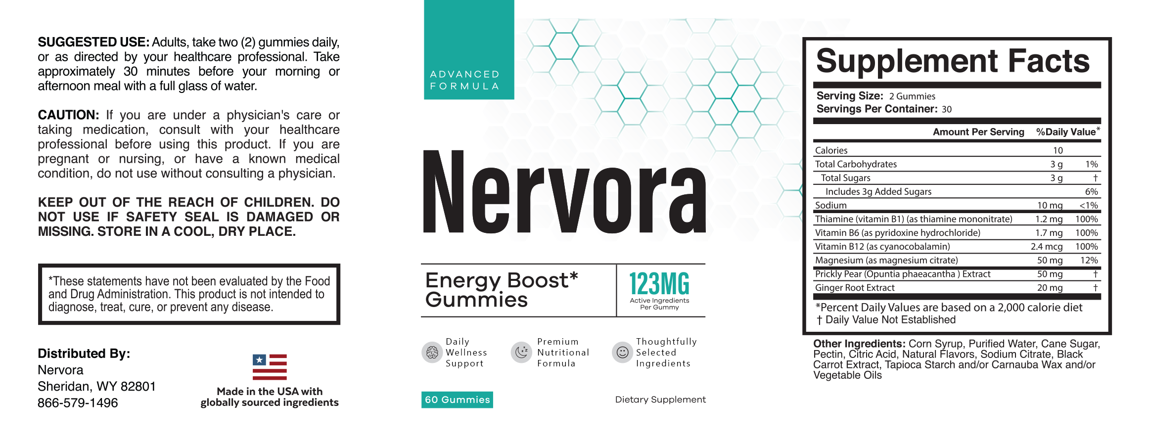 Nervora Energy Gummies are a convenient daily supplement made with essential B vitamins, magnesium, and botanical ingredients. Each serving provides 100% of the daily value of Thiamine (B1), Vitamin B6, and Vitamin B12.